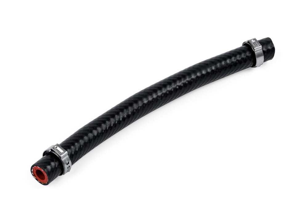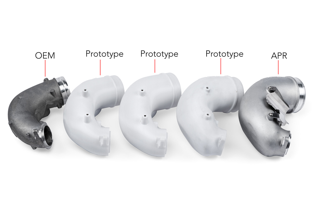 The APR Turbocharger Inlet System uses a massive 4" carbon-fibre inlet tube that attaches to the factory airbox, or the APR Intake Filter System. Attached to the carbon fibre tube is a massive 4" cast-aluminium inlet that is organically shaped to retain the largest possible cross-sectional area within the pipe all the way to the inlet of the turbocharger's compressor cover. Despite the visually odd shape, keeping the cross-sectional area as large as possible is the key to the pipe's performance gains, and greatly outflows smooth looking continuously tapering designs.