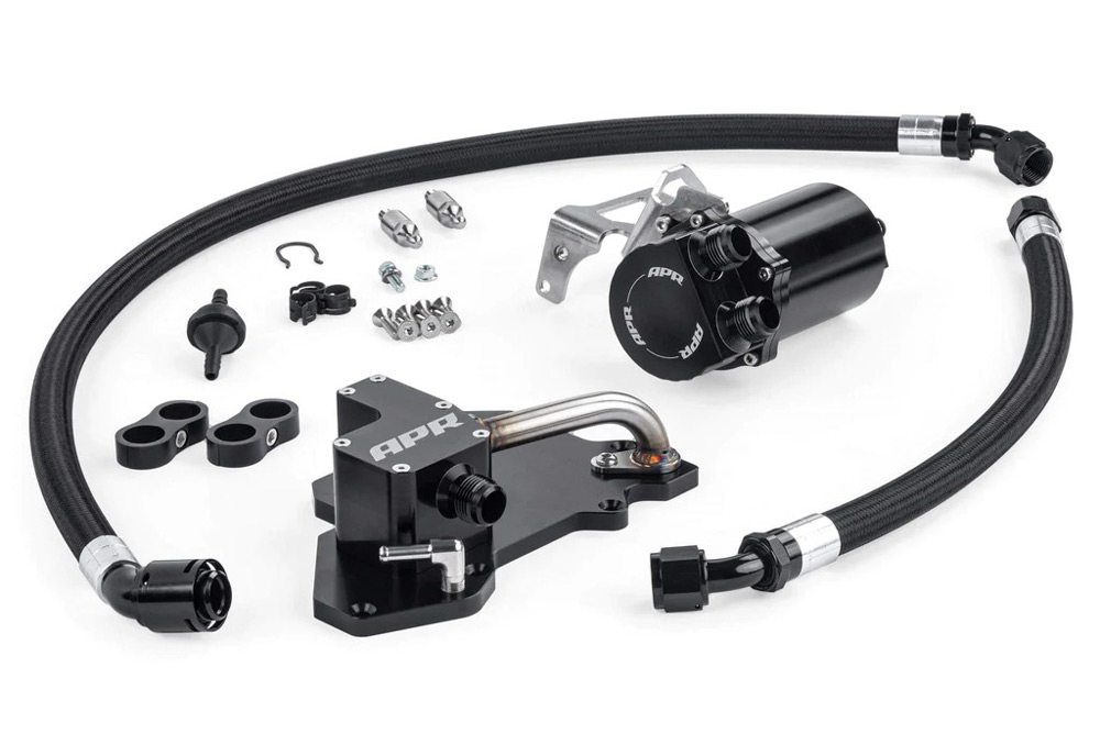 The APR Catch Can System with PCV Plate is a comprehensive upgrade to your engine's Positive Crank Ventilation (PCV) system. This factory-racecar-inspired system takes a multi-step approach to address several performance-robbing issues and critical engine safety concerns with the factory system. The basis for the system is simple: Your engine's factory PCV system has several issues. The APR Catch Can System with PCV Plate addresses each one.