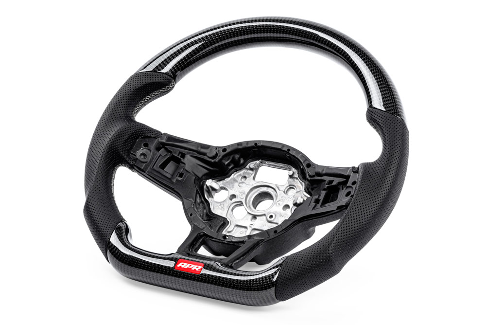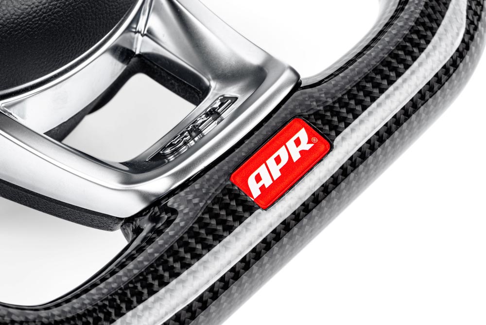 The APR Steering Wheel is beautiful, functional and convenient to purchase. The top and bottom sections feature a carbon-fibre weave, and the sides are motorsport-inspired perforated leather with colour-matched stitching. The deep-pocketed palm and thumb grooves on the sides give you a confidence-inspiring grip and feel comfortable in your hands, as do the ergonomically shaped finger grooves at the top rear of the wheel.